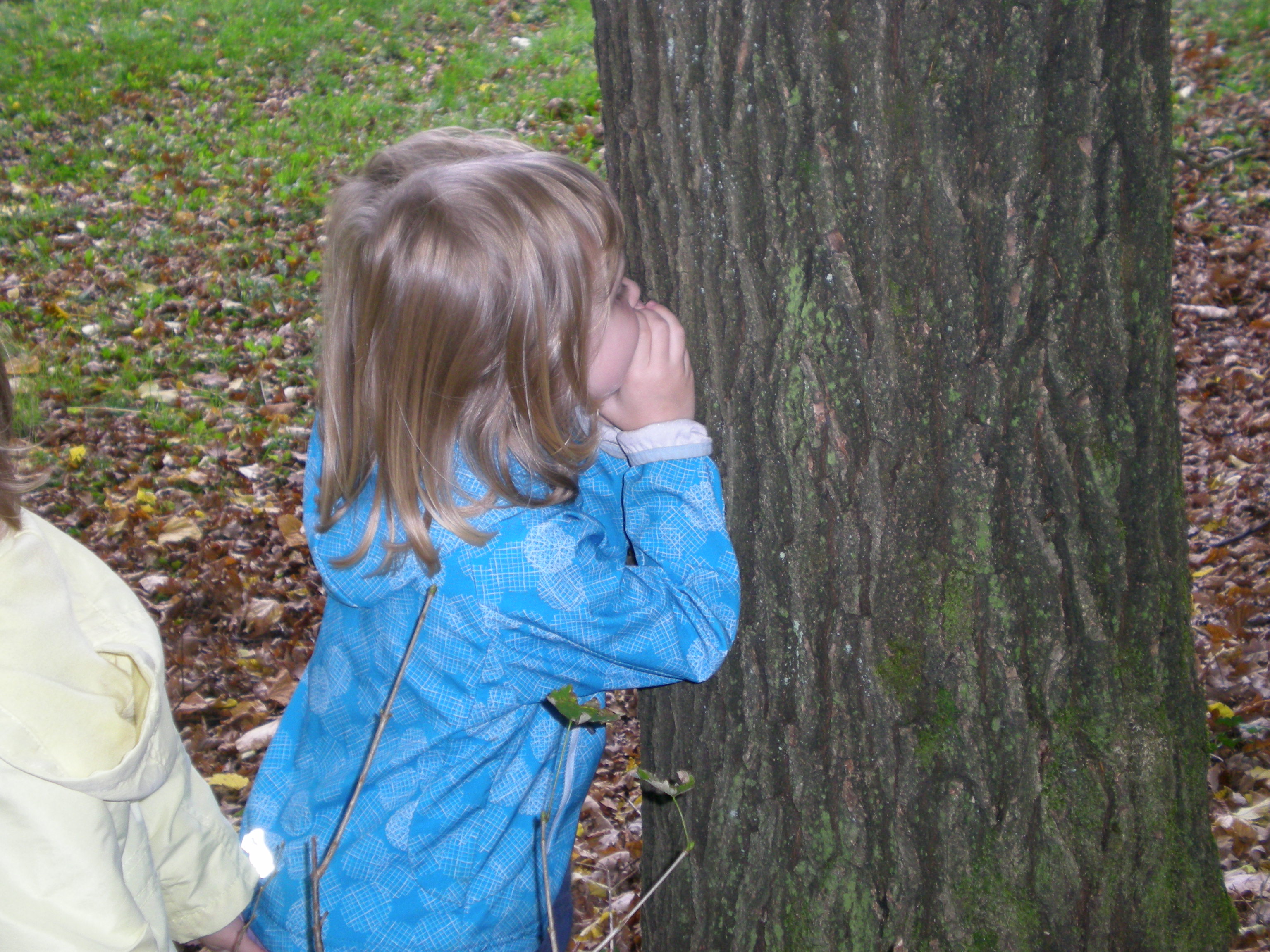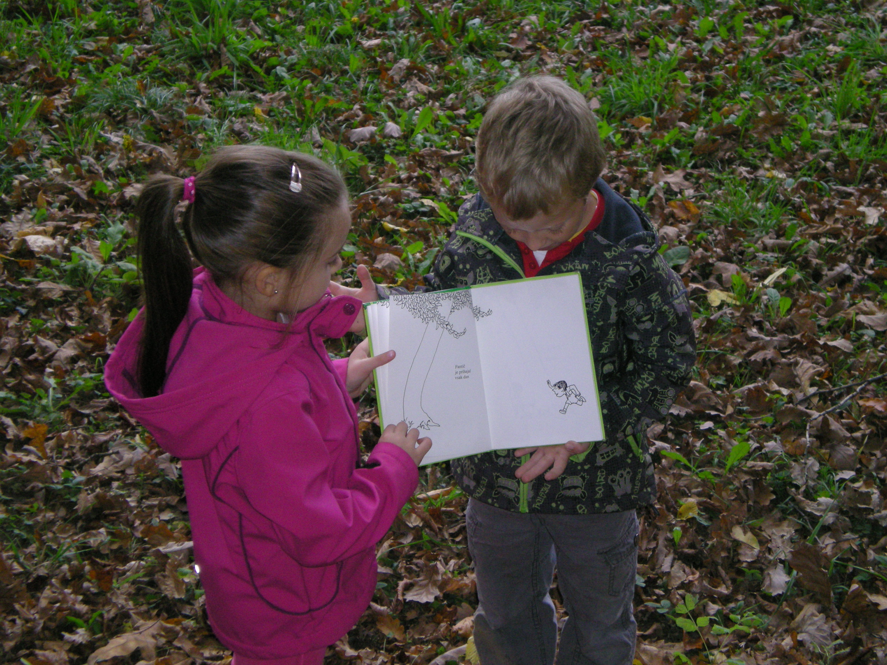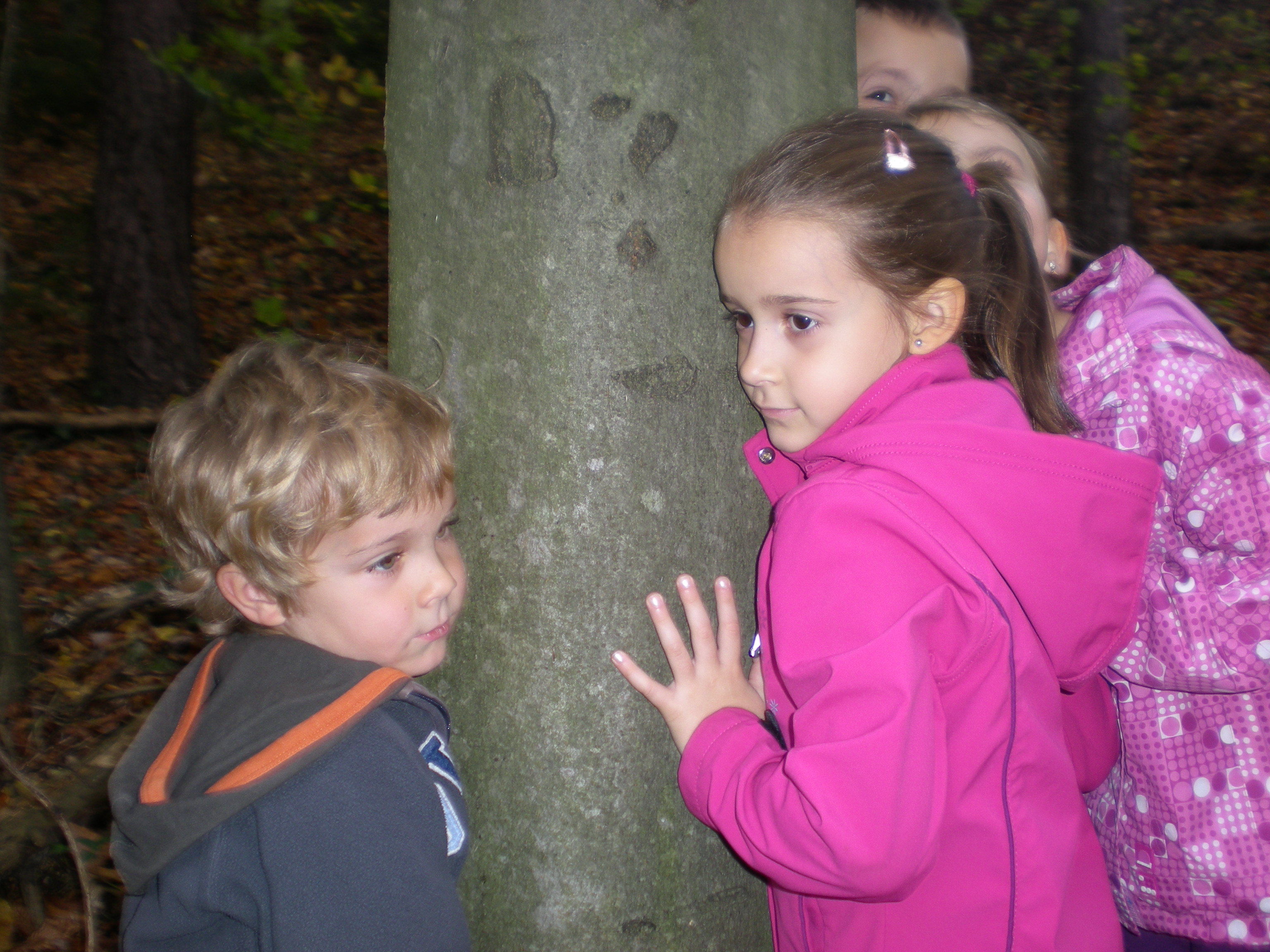Ko sem jim prebrala vsebino knjige, jim nisem povedala naslova. Poiskati so ga morali sami. Podali so zanimive ideje, kako bi slišani zgodbi dodelili naslov. Nato smo se podali v gozd, kjer smo si poiskali svoje drevo. Drevo smo našli. Z njim smo se pogovarjali, ga božali, mu zaupali skrivnosti,…Otroci so gozdu, s pomočjo slikanice, pripovedovali zgodbo. Predno smo se vrnili v vrtec, smo nabrali plodove dreves; žire in želode.