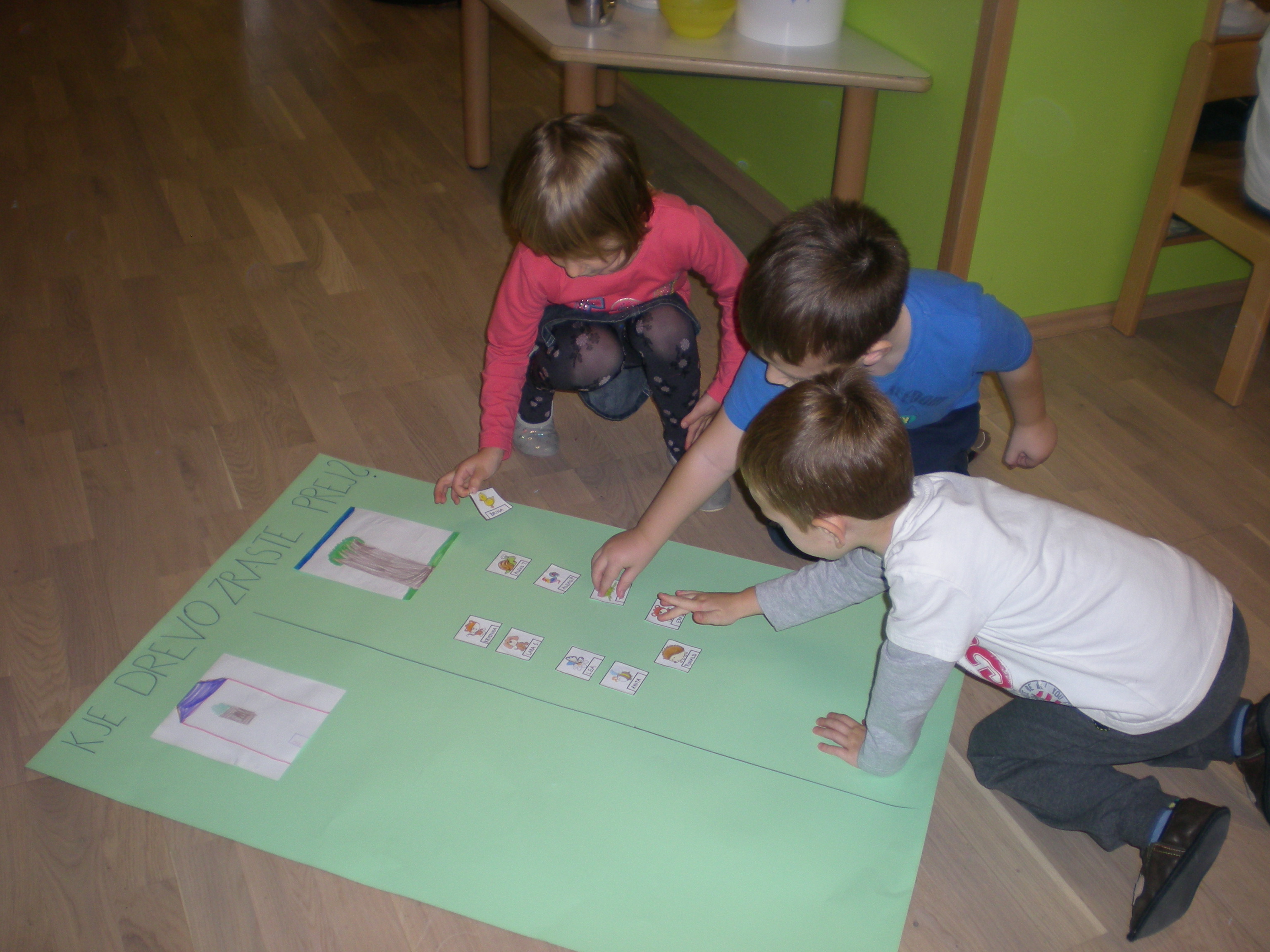 Vsak otrok je v svoj lonček posadil seme, lonček postavil ven na teraso in vsakodnevno skrbel ter opazoval svojo posajeno drevo. Nad rezultati so bili razočarani, kajti nobeno seme ni vzklilo. Obiskali smo prijatelje iz druge skupine, kateri so semena postavili v igralnico. Njihov prostor se je spremenil v čisto pravi gozd. Ugotavljali smo, kakaj je temu tako. Otroci so, s pomočjo najinega usmerjanja, ugotovili, da vremenske razmere niso bile ugodne, da bi drevo zraslo.