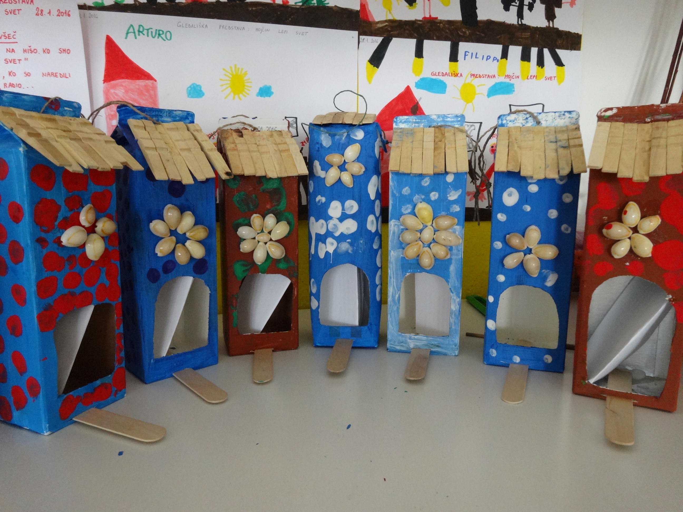 Maske gozdnih živali iz odpadnega materiala – rjave vrečke za kruh Ptičje krmilnice iz odpadnega materiala – škatle tetrapak, ščipavke, školjke Velik snežak iz odpadnega materiala – stari časopisi, zamaški, koščki blaga Podoživljanje zime in zimske pokrajine in njeno upodabljanje s flomastri |